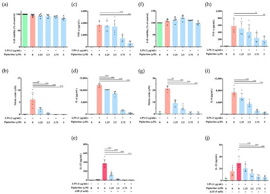 The anti-inflammatory effects of piplartine on murine peritoneal and bone marrow-derived macrophages. (a,f) Cells were pretreated with different concentrations (0–5 μM) of piplartine (1 h) and then treated with 1 μg/mL LPS (24 h). Cell viability was analyzed by MTT assay. (b,g) The production of NO was determined by Griess reagent assay. The levels of (c,h) TNF-α and (d,i) IL-6 were detected using ELISA. (e,j) Cells were pretreated with different concentrations (0–5 μM) of piplartine (1 h), primed with 1 μg/mL LPS (5 h), and stimulated with 5 mM ATP (30 min). Cell culture supernatants were harvested, and levels of IL-1β were examined using ELISA. Significant differences are indicated as * p < 0.05, ** p < 0.01 and *** p < 0.001.
