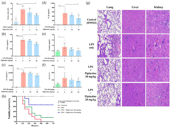 Murine endotoxemia model through LPS injection is a commonly used animal model for sepsis study, which presents overreactive inflammatory responses and acute tissue injuries, including lung, liver and kidney [23], so the anti-inflammatory effects of piplartine were further investigated using LPS-challenged mice. Mice were intraperitoneally injected with piplartine (1 h) and then intraperitoneally injected with LPS to induce experimental sepsis. After the administration of LPS for 4 h, blood was collected, and the levels of NO, TNF-α, IL-6, IL-1β, creatinine and ALT were analyzed, and lung, liver and kidney tissues were harvested for HE staining. As shown in Figure 5a–f, piplartine significantly suppressed the production of NO, TNF-α, IL-6 and IL-1β and moderately attenuated the levels of creatinine (CRE) and alanine aminotransferase (ALT) in LPS-challenged mice. As shown in Figure 5g, lung injury (increase in alveolar wall thickness and increase in inflammatory cell infiltration), liver injury (increase in inflammatory cell infiltration) and kidney injury (increase in inflammatory cell infiltration) were found in the LPS-challenged group. Notably, the administration of piplartine revealed a protective effect by attenuating lung, liver and kidney injuries (Figure 5g). During sepsis, the overwhelming production of proinflammatory cytokines and mediators leads to an increase in tissue damage or lethality. Our results showed that piplartine inhibited proinflammatory cytokine and mediator productions (Figure 5a–f) and protected tissue damages (Figure 5g) in LPS-challenged mice. In addition, whether piplartine possessed protective effects on LPS-induced septic shock was further examined. Mice were intraperitoneally injected with 10 or 20 mg/kg piplartine (1 h) and then intraperitoneally injected with 50 mg/kg LPS. The survival rate was monitored for 5 days. The experimental results indicated that piplartine significantly increased the survival rate compared to the LPS-alone group (Figure 5h).
