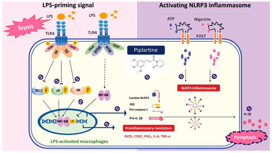 Our experimental results demonstrated that piplartine suppresses the production of proinflammatory mediators and cytokines through inhibiting MAPKs/NF-κB signaling pathway and NLRP3 inflammasome activation by LPS-activated macrophages and protects LPS-induced septic shock, suggesting that piplartine might have benefits for treating sepsis (Figure 6). Therefore, piplartine could be a potential agent to combat bacterial sepsis.