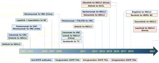 Milestones of anti-EGFR therapeutics approved globally. Some important milestones of regulatory approval for EGFR inhibitors are presented. See Table 1 and Table 2 for more details. If not specified in parentheses, anti-EGFR therapeutics were approved by the US Food and Drug Administration (US FDA). Abbreviations: BC, breast cancer; CRC, colorectal cancer; HNC, head and neck cancer; NSCLC, non-small cell lung cancer; TC, thyroid cancer; TKIs, tyrosine kinase inhibitors.