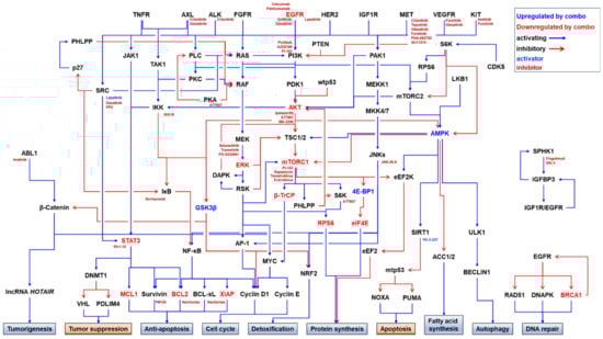 The components in the downstream pathways of RTKs, such as the RAS/RAF/MEK/ERK, PI3K/AKT/mTORC1, and JAK/STAT3 pathways, have been studied as intervening nodes either for monotherapy or combination therapy for TNBC cells [170,171,172,173]. However, the EGF-induced activation of the RAS/RAF/MEK/ERK and PI3K/AKT/mTORC1 pathways persists even in the presence of lapatinib in EGFRi-resistant TNBC cell lines, suggesting that EGFRi resistance occurs through the bypassing activation of downstream survival pathways [99].