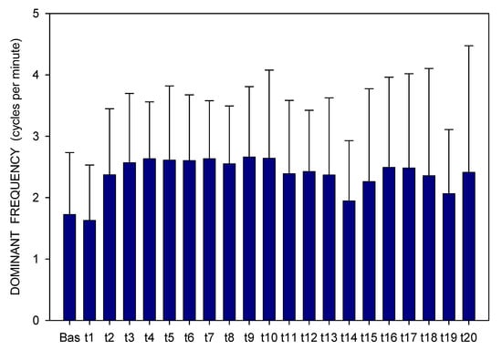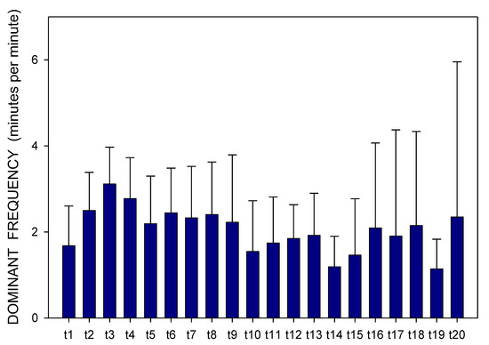 Electrogastrography. Dominant frequency in animals with a shorter small bowel transit time (272 ± 60 min); mean + standard deviation. Explanatory note: t: 15-min study recordings after galantamine administration (t1: time interval between 0–15 min ... t20: time interval between 286–300 min).