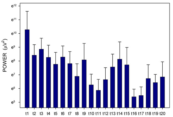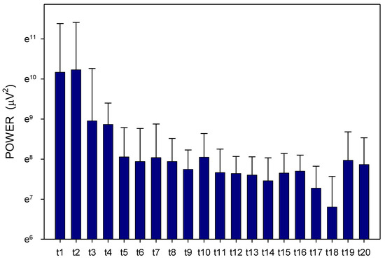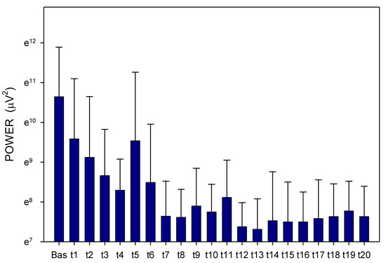 Electrogastrography. EGG power in animals with a shorter small bowel transit time (272 ± 60 min); mean + standard deviation. Outliers omitted. Axis Y: natural logarithm scale. Explanatory note: t: 15-min study recordings after galantamine administration (t1: time interval between 0–15 min ... t20: time interval between 286–300 min).