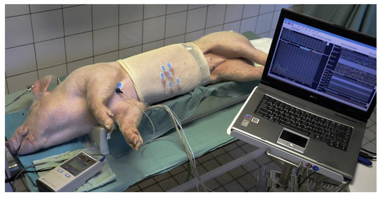 Arrangement of electrogastrography in experimental pigs. All recordings were accomplished under general propofol anaesthesia. Monitoring of vital functions was performed throughout the procedures.
