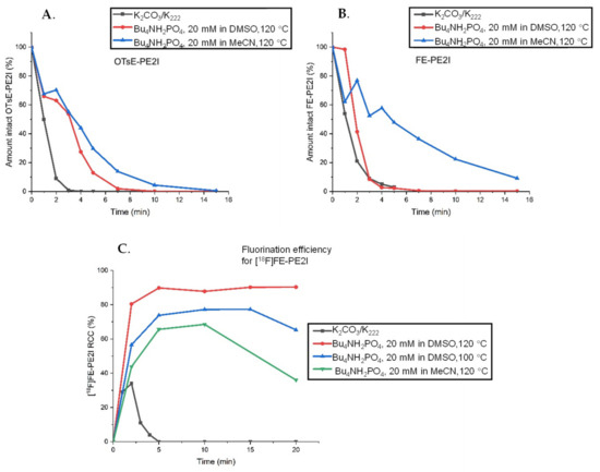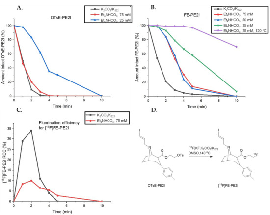 3.3. Detailed Description of the Manual Optimization of Reaction Conditions; Details for Stability Studies of FE-PE2I and OTsE-PE2I and the Manual Fluorination Reaction of [18F]FE-PE2I