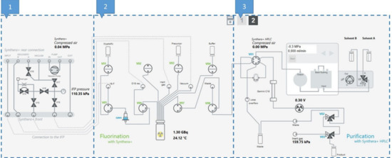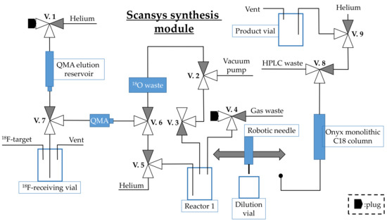 3.4. Process Description of the Production of [18F]FE-PE2I on a Scansys Synthesis Module