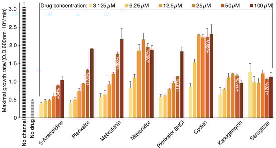 The results shown in Figure 1 indicate that the following eight drugs are able to revive bacterial growth to varying extents: 5-Azacytidine (+84%), Plerixafor (+173%), Mebrofenin (+263%), Mavorixafor (trihydrochloride) (+302%), Plerixafor (octahydrochloride) (+137%), Cyclen (+359%), Kasugamycin (hydrochloride hydrate) (+141%), and Saroglitazar Magnesium (+120%). The values in parenthesis are the growth enhancement of each chemical at 50 µM relative to untreated bacteria. Finally, see panels a and b of Supplementary Figures S1–S8 for raw growth curves of each of the compounds, alongside detailed chemical structures shown in Figure 2.