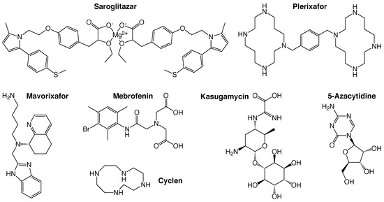Chemical structures of the hits identified in the study. Note that the only the uncomplexed form of Plerixafor is shown.