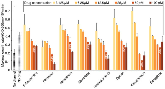 Using the aforementioned approach, we screened 2839 chemicals from the drug repurposing library of MedChem Express (Monmouth Junction, NJ, USA) (note that the number of compounds in the library increases with time). Specifically, bacterial cultures were grown overnight in 96-well plates, and the impact of each chemical in the library at a concentration of 100 µM was tested individually. Finally, any hit was then analyzed at several different concentrations to obtain a dose–response curve.