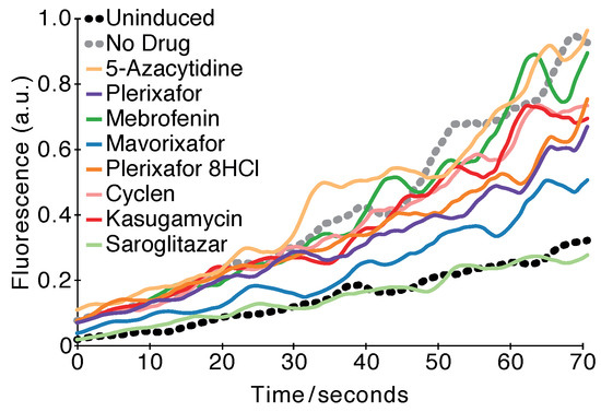 Gratifyingly, most of the hits identified by the positive and negative assays were able to lower the fluorescence change, with the exception of 5-Azacytidine and Mebrofenin (Figure 4). Since non-specific factors influencing pH may obfuscate detection, we decided not to eliminate the latter two chemicals from our hits list to be as inclusive as possible.