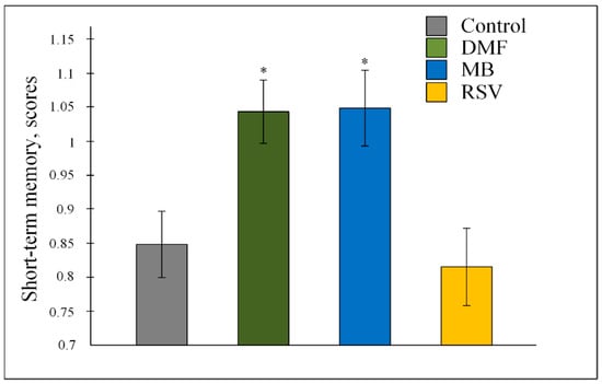 Nrf2/ARE activators changed the values of short-term memory F (3, 647) = 5.6069, p < 0.001. The post-hoc test showed that MB and DMF increased the number of scores by about 20% (both p < 0.05) compared with the control (Figure 2).