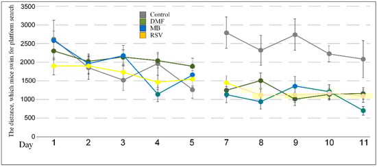The distance that mice swam for the platform search during acquisition and reversal learning. The results expressed as means ± SEM. Control n = 8, DMF = 9, MB = 6, RSV = 8.