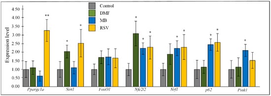 All three studied compounds stimulated a 2–3-fold increase in the expression of the nuclear factor erythroid 2-related factor 2 (Nfe2l2) gene in the hippocampus of 15-month-old mice (all p < 0.05). DMF increased expression of sirtuin 1 (Sirt1) (p < 0.05). MB increased expression of mitophagy-related genes p62 and PTEN-induced kinase 1 (Pink1) (both p < 0.05) and nuclear respiratory factor 1 (Nrf1) (p < 0.05). RSV increased expression of PPARG coactivator 1 alpha (Ppargc1a) (p < 0.01), Sirt1, Nrf1, and p62 (all p < 0.05). All three studied Nrf2/ARE activators stimulated more than 50% increase in the expression of the fork box O1 (FoxO1) protein compared to the control, but there were no statistically significant changes (Figure 4).