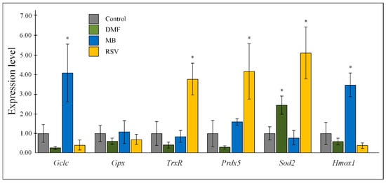 Expression of antioxidants in the hippocampus. The results expressed as means ± SEM. Control n = 8, DMF = 9, MB = 6, RSV = 7. * p < 0.05, comparison of the control group and treated groups using Tukey’s post-hoc test.