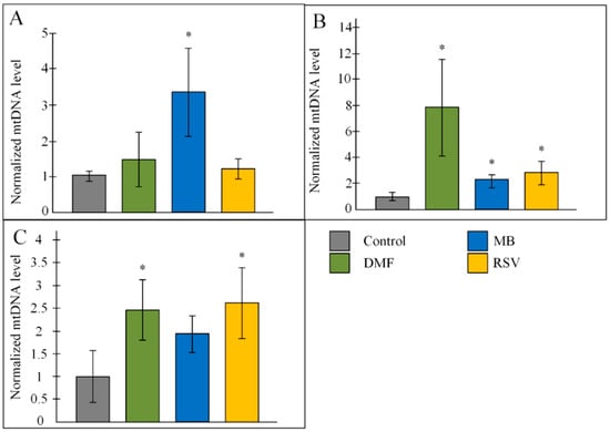 Copy number of mtDNA in the (A) hippocampus, (B) cortex, (C) mid-brain. The results expressed as means ± SEM. Control n = 8, DMF = 9, MB = 6, RSV = 7. * p < 0.05, comparison of the control group and treated groups using Tukey’s post-hoc test.