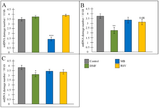 Amount of mtDNA damage in the (A) hippocampus, (B) cortex, (C) mid-brain. The results expressed as means ± SEM. Control n = 8, DMF = 9, MB = 6, RSV = 7. The results expressed as means ± SEM. Control n = 8, DMF = 9, MB = 6, RSV = 8. * p < 0.05, ** p < 0.01, *** p < 0.001, comparison of the control group and treated groups using Tukey’s post-hoc test.