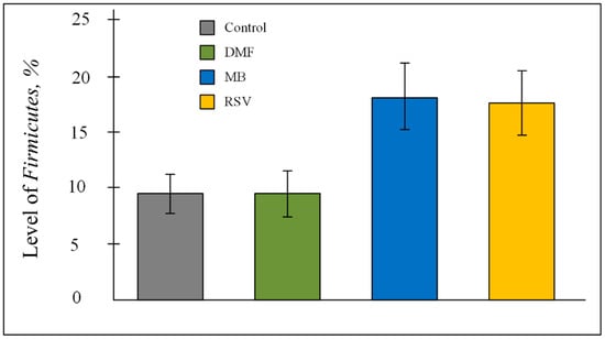 Level of Firmicutes phylum level in the gut microbiome. The results expressed as means ± SEM. Control n = 8, DMF = 8, MB = 6, RSV = 6.