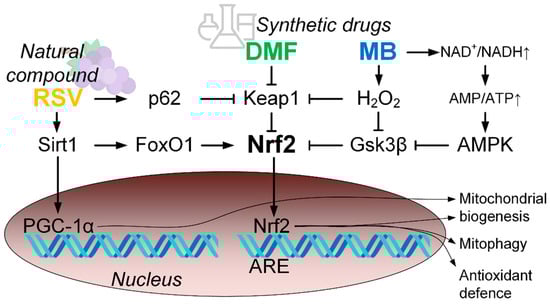 Scheme of the activation of the Nrf2/ARE signal pathway by dimethyl fumarate (DMF); methylene blue (MB); resveratrol (RSV).