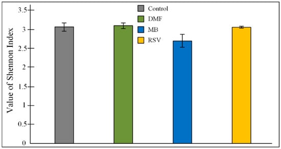 Value of Shannon index (H) of alfa-diversity. The results are expressed as means ± SEM. Control n = 8, DMF = 6, MB = 6, RSV = 6.