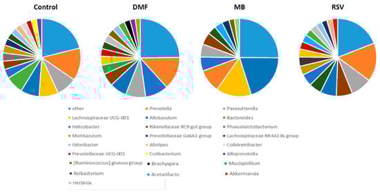 NGS analysis showed that genus Prevotella (Bacteroidetes phylum) was dominant in the control group (0.135 ± 0.031), DMF group (0.135 ± 0.058), and RSV group (0.160 ± 0.027). In the MB group, genus Lachnospiraceae UCG-001 (Firmicutes phylum) was dominant (0.147 ± 0.062), while the Prevotella amount was lower (0.096 ± 0.018) (Table 7).