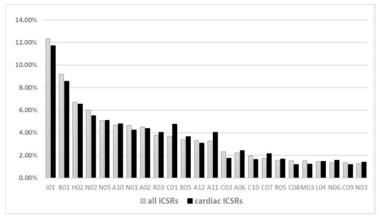 Distribution (not mutually exclusive) of other suspected/concomitant drugs reported in the remdesivir ICSRs. Legend: J01: antibacterials for systemic use; B01: antithrombotic agents; H02: corticosteroids for systemic use; N02: analgesics; N05: psycholeptics; A10: drugs used in diabetes; N01: anesthetics; A02: drugs for acid related disorders; R03: drugs for obstructive airway diseases; C01: cardiac therapy; B05: blood substitutes and perfusion solutions; A12: mineral supplements; A11: vitamins; C03: diuretics; A06: drugs for constipation; C10: lipid-modifying agents; C07: beta-blocking agents; R05: cough and cold preparations; C08: calcium channel blockers; M03: muscle relaxants; L04: immunosuppressants; N06: psychoanaleptics; C09: agents acting on the renin–angiotensin system; N03: antiepileptics.