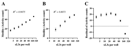 First, experiments were conducted to establish the optimum density of xL3s in wells of plates for HTS (i.e., motility measurement). To do this, we undertook a regression analysis for motility (activity counts) using a two-fold serial dilution series (i.e., 3, 6, 12, 25, 50, 100 or 200 xL3s per well). We assessed and compared the correlation (R2) between larval density and motility using 96-well and 384-well plates. There was a clear relationship using both types of plates, with a higher coefficient (R2) achieved for the 384-well plate (91%) than the 96-well plate (81%) (Figure 1A,B). For the former data set (384-well plate), a residual analysis revealed a non-linear relationship between the larval density and motility, resulting in positive residuals for densities of up to 100 xL3s per well and in negative residuals for 200 xL3s per well, with variation (standard error of the mean, SEM) among replicates (n = 16) being less for densities of 50 xL3s and 100 xL3s (SEM: ≤ 1.7) than for ≤ 25 xL3s per well (SEM: ≥ 2.0) (Figure 1C). Based on these findings, we selected a density of 80 xL3s per well for the screening assay (in 384-well plates).