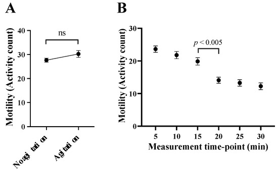 Evaluation of the effect of agitation and measurement time-point on larval motility. The effect of the agitation of 384-well plates—using an orbital shaker (120 rotations per min) for 15 min—on the larval motility (using 100 xL3s per well) was assessed after 90 h of incubation at 38 °C and 10% CO2 (A); no significant increase in larval motility was achieved by the agitation. The larval motility was observed over 30 min to determine the duration of measurement time by assessing the motility reduction over time (B). After 15 min, the motility decreased significantly; thus, the optimal duration for motility measurement was determined to be up to 15 min. Data points represent 60 replicates; mean ± standard error of the mean (SEM); ns = not significant.