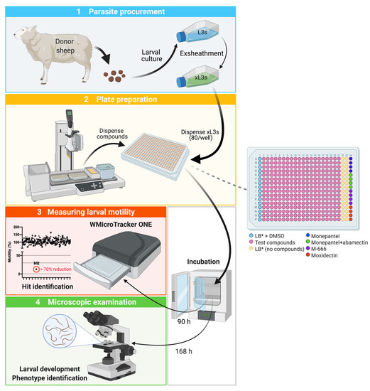 Workflow (four steps) used for the discovery of compounds with anthelmintic effects against larvae of Haemonchus contortus. Step 1—Parasite procurement: Donor sheep are experimentally infected with 7000–9000 H. contortus third-stage larvae (L3s) to produce a patent infection (after ~21–24 days). Faecal samples are collected from a sheep with a patent infection and then subjected to copro-culture at 27 °C and 100% humidity for one week to allow H. contortus eggs to embryonate, and larvae to hatch and develop; L3s are harvested, washed and then stored in sterile water at 11 °C (constant) for ≤6 months. Immediately prior to screening, L3s are exsheathed in 0.15% (v/v) sodium hypochlorite (NaClO) at 38 °C for 20 min and washed five times in sterile physiological saline (pH 7.4) by centrifugation at 500× g (5 min) at room temperature (22–24 °C). Step 2—Plate preparation for screening: Test and control compounds are dispensed, diluted in LB* into 384-well plates using a semi-automatic pipetting robot (ASSIST PLUS, Integra Biosciences) and 80 exsheathed L3s (xL3s) are added to individual wells. The compounds are arrayed on each plate, with 16 wells being negative-controls (with LB* + 0.4% DMSO) and four wells with each of the positive-control compounds: monepantel, moxidectin, monepantel+abamectin and M-666 (20 µM). Step 3—Measuring larval motility: Following a 90 h-incubation at 38 °C, 10% (v/v) CO2 and >95% of relative humidity, the motility of xL3s is measured using the WMicroTracker ONE instrument (Phylumtech, Argentina), and test-compounds with an anthelmintic effect (i.e., ‘hits’) are identified based on a ≥ 70% reduction in xL3 motility. Step 4—Microscopic examination: Following a total incubation period of 168 h (7 days) under the same incubation conditions, larval development and morphology (=phenotype) are assessed by light microscopy (100-times magnification).