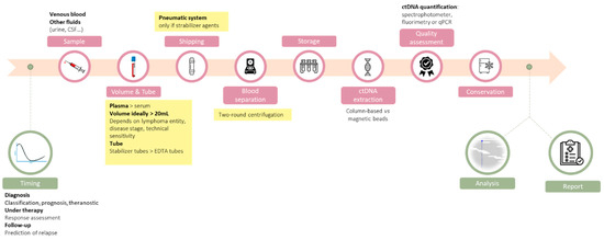Regarding lymphomas, studies have pointed out the clinical value of ctDNA to refine the diagnosis, to identify predictive biomarkers of response to therapy, to monitor response to treatment, and to detect relapses earlier [6,7,8,9]. One of the biggest challenges in this field is to move from proof-of-concept studies to a real-life setting in order to improve the outcome of lymphoma patients. Careful technical and clinical validation are warranted to adapt ctDNA analysis from highly specialized translational teams to routine laboratories, and we have to achieve this as fast as possible to transform a promising biomarker into a routine analysis to have a direct consequence on patient care. Recently, a study comparing eight up-to-date ctDNA analysis platforms has demonstrated that it remains technically challenging to detect variants below the 0.5% sensitivity threshold [10]. Given this analytical limitation, improving the preanalytical steps to recover high levels of ctDNA of optimal quality is of utmost importance. In this review, we propose a step-by-step description of the preanalytical process to obtain high quality ctDNA, emphasizing the technical choices that need to be made and the experimental data that can support these choices (Figure 1). We have highlighted the technical choices that can be recommended based on our review of the literature when sufficient level of evidences are available.