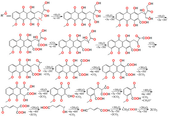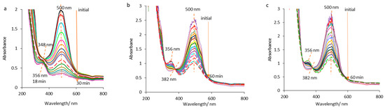 Figure 1a shows the epirubicin spectra in aqueous HCl solution (λmax = 500 nm) recorded during electrolysis, every 2 min, indicating that it degrades almost completely in 30 min. The absorbance declined from 2 value to 0.34, and consequently the concentration decreased from 2.57 × 10−4 mol L−1 to 4.37 × 10−5 mol L−1 (both, approximately of 5.9 times) very close to the EPR detection limit.