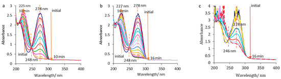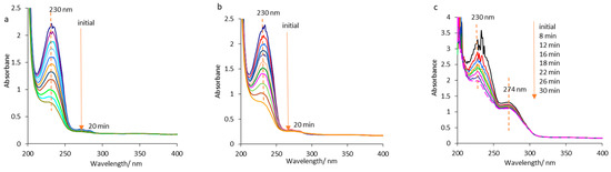 Gemcitabine UV-Vis spectra recorded during electrolysis at a constant current density of 50 mA cm−2: (a) in aqueous HCl solution (GCT_HCl); (b) in supporting electrolyte, in the absence of essential oil (GCT_SE); (c) in supporting electrolyte, in the presence of essential oil (GCT_ESO).