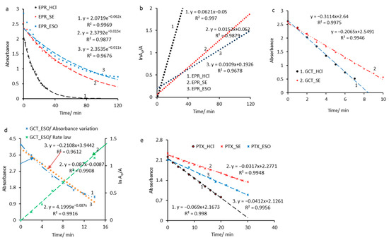 The kinetic models that fitted most appropriately the experimental data, with a coefficient R2 very close to unity are shown in Figure 4. Thus, from Figure 4a it is observed that, in the case of epirubicin decomposition reaction, in all studied media, EPR_HCl, EPR_SE, and EPR_ESO, the absorbance varies exponentially over time, respecting the kinetics of the first-order reactions. It should be noted that, in the case of the EPR_ESO system, the coefficient R2 reaches the value of 0.967. This deviation requires a designation closer to reality for EPR decomposition in ESO, such as pseudo-first-order reaction kinetics.