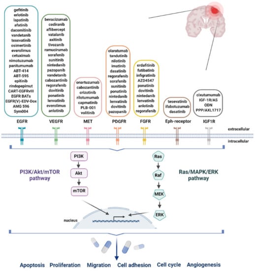 Numerous drugs that inhibit RTKs and their signaling cascades downstream are currently in phase I and II clinical trials, either in combination with other FDA-approved chemotherapeutic agents such as TMZ, or as emerging, monotherapeutic agents [67,68]. Figure 1 gives an overview of RTKIs that reached the clinic for the treatment of GB.