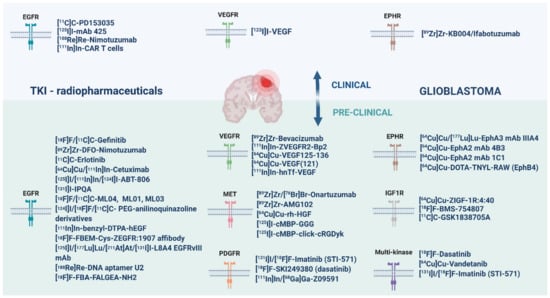 TKIs, mAb and SMI have previously been radiolabeled for diagnostic purposes, some also for use in TRT, with progress in the field of epidermal growth factor receptor (EGFR) radio-immunotherapy (RIT) [23,27,28,49,50,51,52]. For instance [188Re]Re-nimotuzumab and [125I]iodo-mAb 425 are in a clinical stage for GB and [177Lu]Lu]-/[211At]At-L8A4 (EGFRIII) mAb and [177Lu]Lu-cetuximab are in a preclinical stage for GB [37,53,54,55,56,57,58]. In addition, RTK signaling is affected by ionizing radiation and hence the combination of TKI and RT (external beam radiation therapy or TRT) could have synergistic effects [59].