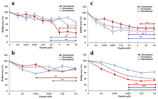 - Pletzer, D.; Hancock, R.E.W. Antibiofilm Peptides: Potential as Broad-Spectrum Agents. J. Bacteriol. 2016, 198, 2572–2578. [Google Scholar] [CrossRef] [PubMed]