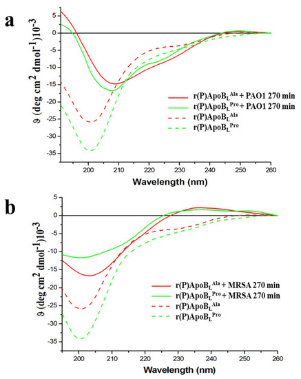 2.7. Conformational Analyses of r(P)ApoBLPro or r(P)ApoBLAla Peptides in the Presence of Susceptible Bacterial Cells