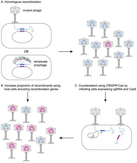 One of the most widely used approaches for phage engineering is homologous recombination, where a heterologous segment of DNA is recombined with the phage genome at sites of homology within a bacterial host (see Figure 2A) [,,]. The efficiency of recombination is very low (10−10–10−4) [,,], so an efficient screening method is necessary to identify recombinant phages [,,]. The recombination efficiency is vastly improved if the phages to be edited are transformed into bacterial strains that express high levels of heterologous recombination proteins such as RecE/RecT-like proteins [] or the lambda red system (see Figure 2B) [,]. The efficiency of recovering recombinant phage can be further improved using CRISPR-Cas to counter-select against non-recombinant phage (see Figure 2C) [,,,,,,,].