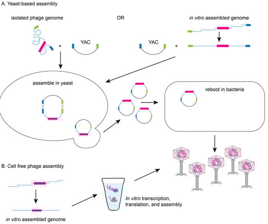 Yeast-based or in vitro phage genome assembly methods have been developed to avoid the possible toxic effect of phage replication on the bacterial host. Since yeast cells have an efficient recombination system [] and phage genes are not toxic to yeast, Saccharomyces cerevisiae can facilitate the assembly of synthetic genomes by transformation associated recombination (TAR) cloning and the assembled genomes can then be electroporated into a permissive bacterial host for rebooting (see Figure 3A) [,]. Alternatively, phage genomes can be assembled in vitro from synthesized DNA fragments that have been assembled by recombination or methods such as Gibson assembly prior to transformation into a permissive bacterial host []. Finally, cell-free transcription-translation systems can create the phage or virus-like particles from DNA in vitro overcoming the need for a highly competent bacterial host (see Figure 3B). The Noireaux laboratory has developed cell-free systems to successfully replicate, synthesize, and assemble infectious T7, phiX174, MS2, and even T4 phage which has a 170 kb genome [,,,].