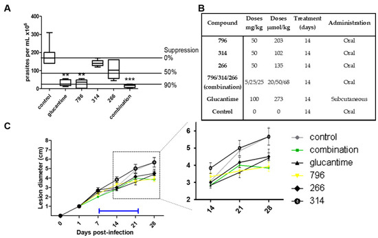 - Fournet, A.; Ferreira, M.E.; De Arias, A.R.; De Ortiz, S.T.; Fuentes, S.; Nakayama, H.; Schinini, A.; Hocquemiller, R. In vivo efficacy of oral and intralesional administration of 2-substituted quinolines in experimental treatment of new world cutaneous leishmaniasis caused by Leishmania amazonensis. Antimicrob. Agents Chemother. 1996, 40, 2447–2451. [Google Scholar] [CrossRef] [PubMed] [Green Version]