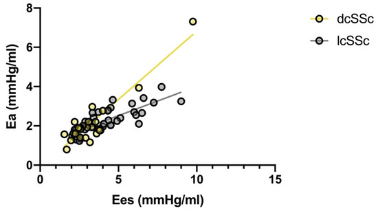 Table 2 shows the differences between patients with dcSSc vs. lcSSc. In particular, LVEDV (p = 0.004), LVESV (p = 0.001), and SV (p = 0.03) were higher in dcSSc patients and LVEF was lower, albeit within the normal range (p = 0.01). Ea (p = 0.01) and Ees (p = 0.001) were lower in dcSSc patients. VAC was significantly higher in dcSSc patients (p = 0.02). PE was higher in dcSSc (p = 0.01) and LV efficiency was lower (p = 0.02) (Table 2). Ees correlated with Ea (ρ = 0.851, p < 0.0001). However, in dcSSc the correlation line is shifted upward and to the left. For the same Ea value, patients with dcSSc presented a lower Ees, indicative of inadequate contractility (Figure 1).