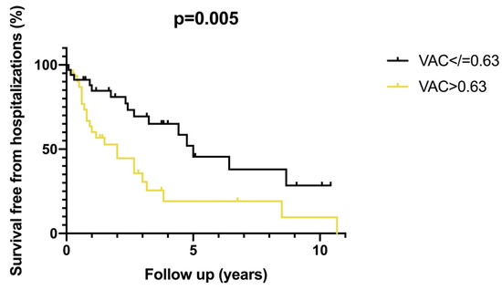 Kaplan Meier estimate of survival free from hospitalizations of patients with VAC ≤ 0.63 (in black), and patients with VAC > 0.63 (in yellow).