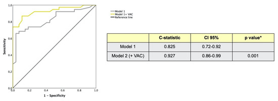 Receiving operating curves in model 1 and model 2 (including VAC > 0.63) for MACEs. C-statistic improves adding VAC > 0.63 in the multivariable model * p value is derived from comparison of model 1 to model 1 plus VAC > 0.63 (model 2).