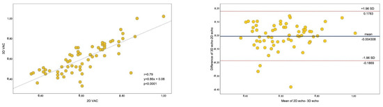 Figure 5 presents a linear regression plot (left panel) and Bland–Altman analysis (right panel) for VAC computed by 2D- and 3D-echocardiography.