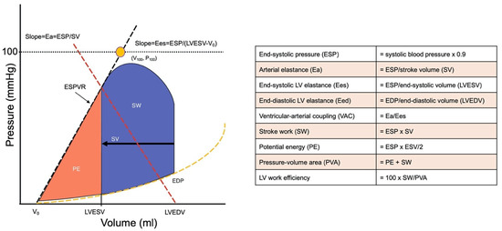 Pressure-volume loops of the left ventricle (left). Measurement of parameters derived from a pressure-volume loop of the left ventricle (right). End-systolic elastance (Ees) represents the slope of the end-systolic pressure volume relationship (ESPVR) where ESP denotes end-systolic pressure, and Ees represents the noninvasively derived single-beat estimation of this parameter. LVEDV is the end-diastolic volume, and LVESV is the end-systolic volume. V0 is the intercept of the ESPVR at an end-systolic pressure of 0 mm Hg, and V100 is the point on the end-systolic pressure volume line at an end-systolic pressure of 100 mm Hg. Effective arterial elastance (Ea) represents the negative slope joining the end-systolic pressure volume point to the point on the volume axis at end-diastole, where SV represents stroke volume.
