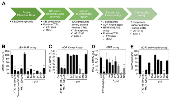 Identification of MASTL inhibitor MKI-2 using in silico and in vitro analyses (A) Schematic summary of in silico-based drug discovery process. Immunofluorescence (B), the ADP-GloTM kinase assay (C) and HTRF kinase assay (D) were performed to determine MASTL activities under the treatments of two positive controls and candidate compounds. (E) MCF7 cells were treated with DMSO (Ctrl), 20 µM AT13148, 20 µM MKI-1, and 1 µM candidate compounds for 72 h. Cell viability was measured using the WST-8 assay. The data are presented as the mean ± standard deviation of three independent experiments. ** p < 0.01.