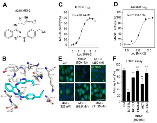Validation of MASTL inhibitor MKI-2 using in silico and in vitro analyses (A) The chemical structure of MKI-2. (B) The docking model of MKI-2 and the MASTL kinase domain. The in vitro or cellular IC50 of MKI-2 was determined by in vitro kinase assay (C) and the IN Cell Analyzer HCA System (D). In at least 4 images, each image that contains more than 500 cells was analyzed from each group by the IN Cell analyzer. (D,E) Immunofluorescence staining was performed using anti-phospho(Ser67) ENSA (green) in MCF7 cells after arrested in mitosis using colcemide (80 ng/mL) and various concentrations of MKI-2 for 14 h. Scale bars = 20 µm. (F) HTRF kinase assay were performed using recombinant AGC kinases to determine AGC kinases activities with 100 nM MKI-2. The data are presented as the mean ± standard deviation of three independent experiments. ** p < 0.01. N.S.: not significant.