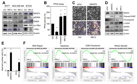Since our previous reports showed that MASTL depletion causes mitotic catastrophe of breast cancer cells [12,22], we next evaluated whether MKI-2 induces mitotic catastrophe. Notably, the microscopic analysis indicated that MKI-2 induced the mitotic arrest of MCF7 cells, which was similar to the mitotic arrest phenotype in MASTL-depleted MCF7 cells (Figure 3C). In addition, we observed increased levels of cleaved-PARP and γ-H2AX and decreased procaspase-2 and phospho-ENSA in MKI-2-treated MCF7 cells, which was consistent with the result in the MASTL-depleted MCF7 cells (Figure 3D). Furthermore, MKI-2 increased aberrance in nuclei of MCF7 cells (Figure 3E), consistent with the observation that MASTL depletion or inhibition increased aberrant nuclei, such as nuclei with irregular shapes or fragmented nuclei in MCF7 cells [12,22]. Moreover, the gene set enrichment (GSEA) analysis from transcript analysis in MKI-2-treated MCF7 cells showed that MKI-2 modulated G2/M arrest, apoptosis, mitotic spindle, and DNA repair of MCF7 cells (Figure 3F), which are the main functions of MASTL [13]. Taken together, our results suggested that MKI-2 causes mitotic catastrophe in breast cancer cells by modulating the MASTL-PP2A axis.