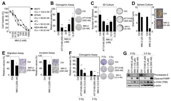 MASTL inhibition reduces the oncogenic properties and enhanced the radiosensitivity of breast cancer cells [12]. Thus, we next examined the antitumor activities of MKI-2 in breast cancer cells through various analyses, including cell viability, clonogenic, mammosphere formation, 3D culture, and invasion and migration assays. The results indicated that MKI-2 inhibited the proliferation of various breast cancer cells, including the human breast cancer MCF7, BT549, and MDA-MB468 cells and mouse breast cancer 4T1 cells with nM range efficacy (IC50 of MKI-2 was 56~124 nM, dependent on cancer cell lines) (Figure 4A). MKI-2 also clearly inhibited the colony and mammosphere formation of MCF7 cells with nM range efficacy (Figure 4B–D). Furthermore, MKI-2 inhibited the migration and invasion of BT549 cells (Figure 4E), indicating that MKI-2 can inhibit the oncogenic properties of breast cancer cells. Next, we found that MKI-2 decreased colony formation in MCF7 cells in response to irradiation (Figure 4F), with increased cleaved-PARP and phospho-Chk2 and decreased procaspase-2 (Figure 4G), which was more potent than AT13148 and MKI-1, suggesting that MKI-2 can enhance the radiosensitivity of breast cancer cells. Therefore, these results collectively suggested that MKI-2 has potent antitumor activities in breast cancer cells.