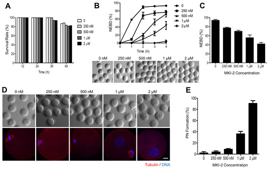 As the function of MASTL has been well characterized in oocytes [8,9,27,28], we validated the MKI-2 activity using mouse oocytes by comparing phenotypes. First, we treated immature oocytes with MKI-2 and examined the cytotoxicity. The survival rate of oocytes treated with various concentrations of MKI-2 was not significantly different among groups (Figure 5A), suggesting that MKI-2 is not toxic up to oocytes. We then examined the effect of MKI-2 on meiotic cell cycle. Consistent with recent studies that the activation of MASTL is essential for G2-M transition [5,29], MKI-2 treatment effectively inhibited GVBD (indicative of the entry into the meiotic M phase in oocytes) in a dose-dependent manner. Moreover, most oocytes remained in the GV stage even after prolonged culture (Figure 5B,C), implying that the effect of MKI-2 is not transient in oocytes. It has been recently shown that MASTL-null oocytes reassembled a nuclear structure containing decondensed chromatin [28]. Therefore, we investigated whether MKI-2 could induce pronuclear formation in oocytes. Notably, oocytes formed distinct nuclei with decondensed chromatin after MKI-2 treatment (Figure 5D,E). Taken together, our results reveal that treating oocytes with MKI-2 displayed similar phenotypes, observed as MASTL-depleted or -null oocytes, corroborating that MKI-2 has the capacity to inhibit MASTL.
