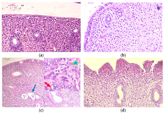 Figure 1. Effect of irbesartan (IRB) on histopathological changes in estradiol benzoate-induced endometrial hyperplasia (EH) and atypia in rats (hematoxylin and eosin, ×200; (n = 7/group). (a,b) Control and IRB groups, respectively, reveal no histopathological abnormalities. (c) In the EH group, the epithelial lining shows hypertrophy and stratification (blue arrow). The insert (×400) shows vesicular nuclei exhibiting atypical features with loss of polarity, anisonucleosis, and prominent nucleoli (red arrow), and the stomas show excessive leukocytic infiltration (asteroid). (d) The EH+IRB group shows a picture suggestive of almost normal-looking disordered endometrial glands, and the lining epithelium was low columnar.